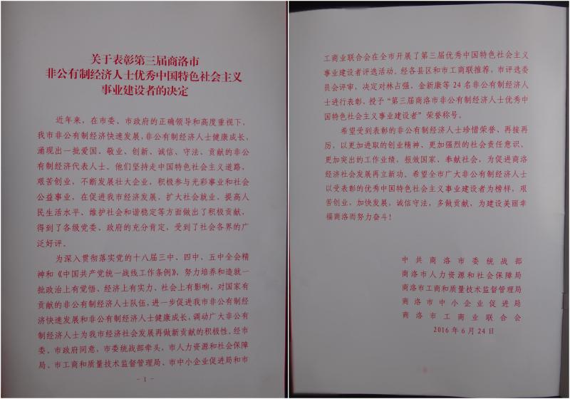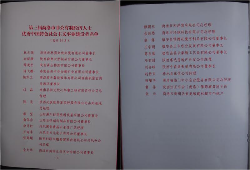 山阳县3名非公有制经济人士荣获“第三届商洛市非公有制经济人士优秀中国特色社会主义事业建设者”荣誉称号: